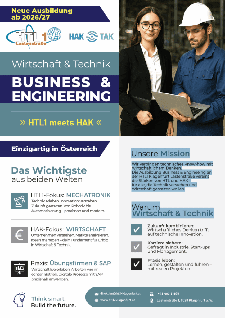 Wir verbinden technisches Know-how mit wirtschaftlichem Denken. Die Ausbildung Business & Engineeing an der HTL1 Klagenfurt Lastenstraße vereint die Stärken von HTL und HAK – für alle, die Technik verstehen und Wirtschaft gestalten wollen.